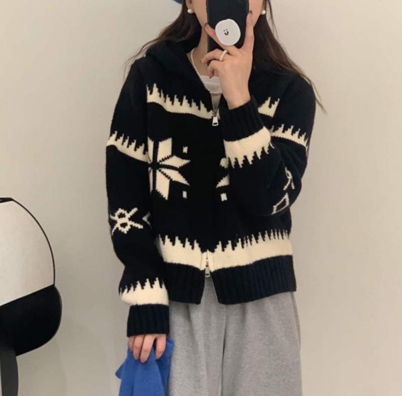 노르딕 눈꽃 집업 니트 후드 가디건