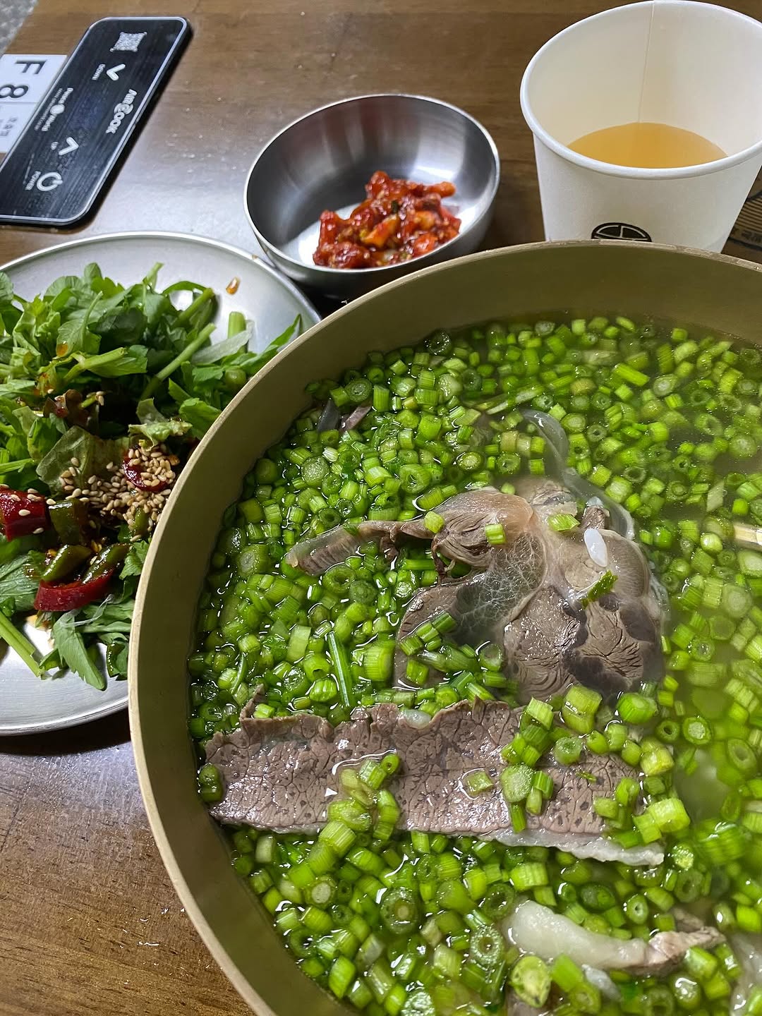 이 집의 또 다른 시그니처 메뉴인 ‘능동 미나리 곰탕’도 놓칠 수 없죠! 🥣 맑고 깊은 곰탕 국물 위에 송송 썬 미나리가 수북이 올라간 비주얼은 처음엔 좀 생소했지만, 한 숟갈 뜨는 순간 그 깔끔하고 향긋한 맛에 반해버렸어요! 💚 뻑뻑하지 않고 부드러운 한우 고기와 함께 먹으니 속까지 든든하고 편안해지는 느낌이었어요. 🥰
