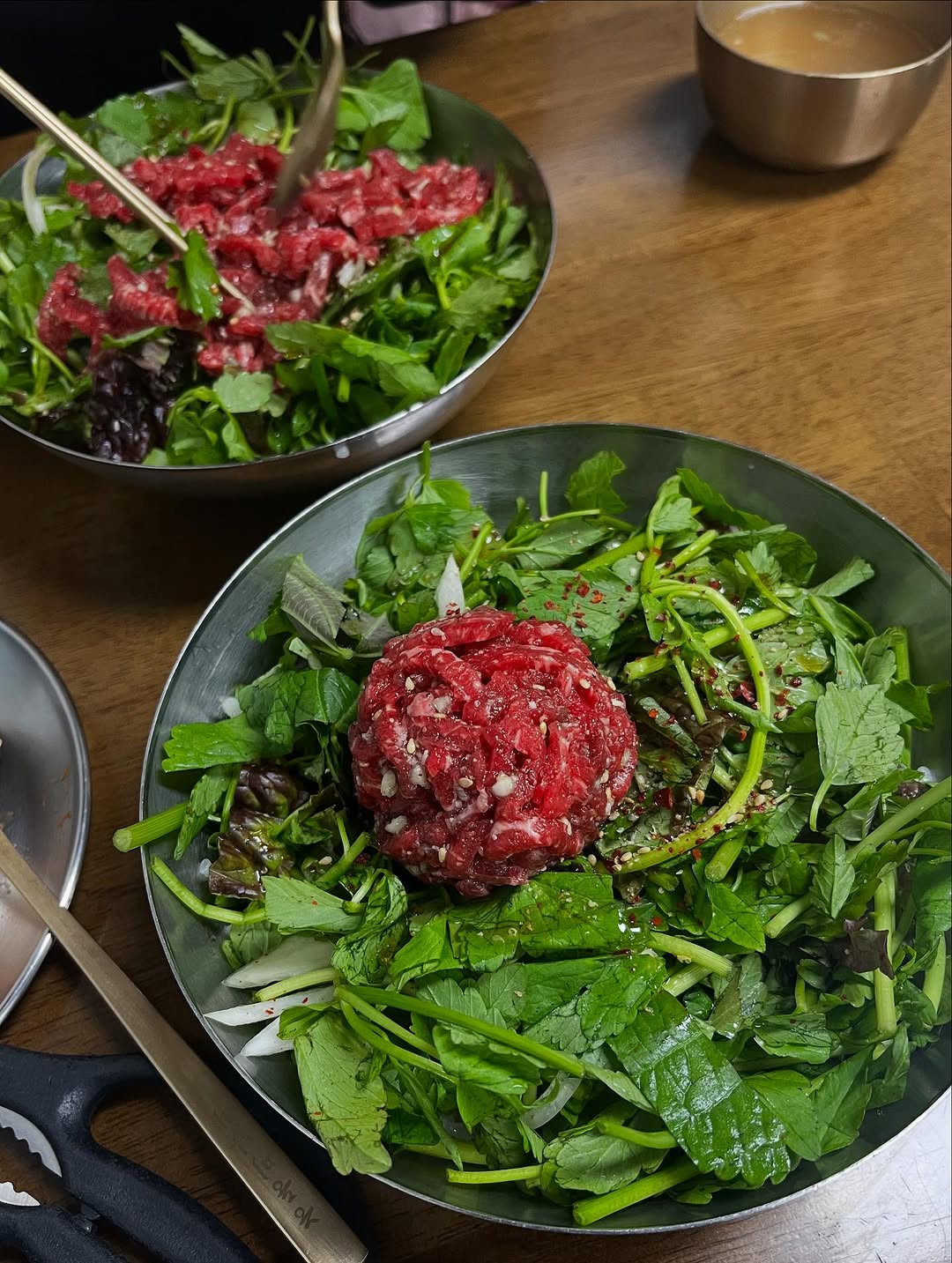 가장 기대했던 메뉴는 역시 ‘능동 육회비빔밥’! 🤩 큼지막하게 썰어낸 신선한 육회와 아삭한 미나리가 듬뿍 올라간 비주얼부터 압도적이었어요. 👍🏼 고추장 양념이 아닌, 은은한 간장 베이스 소스와 고소한 참기름의 조화가 정말 일품이었는데요. 🤤 짭짤하면서도 달콤한 맛이 입안 가득 퍼지면서 미나리의 향긋함과 육회의 고소함이 어우러져 감칠맛을 폭발시켰어요! 💥
