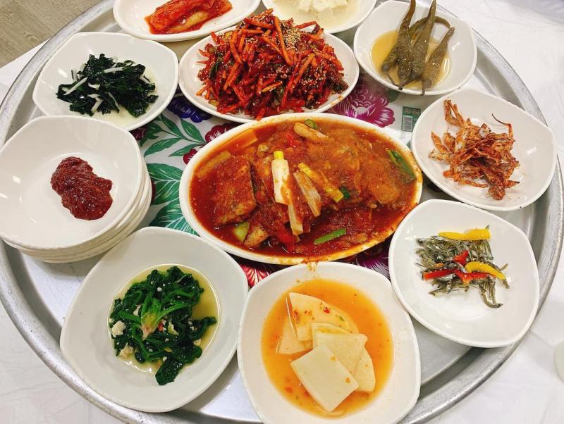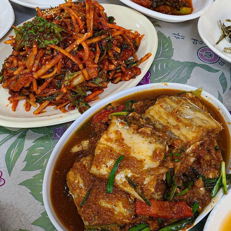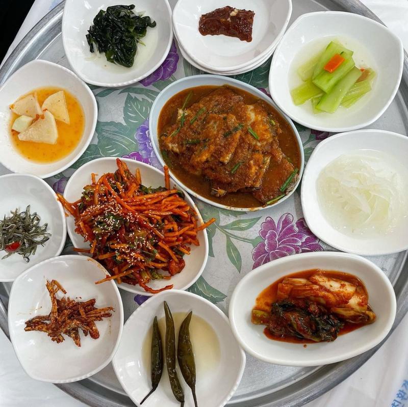 백반집답게 양은원쟁반에 메인메뉴를 중심으로 콩나물국을 포함해서 10가지 갖가지 반찬들로 채워진 꽤 푸짐한 구성이고, 갈치조림과 서대회무침 각 2인분씩 시켰는데 둘다 푸짐한 양에 반찬들 대부분 슴슴한 편이라 은근 많이 먹게 됨.