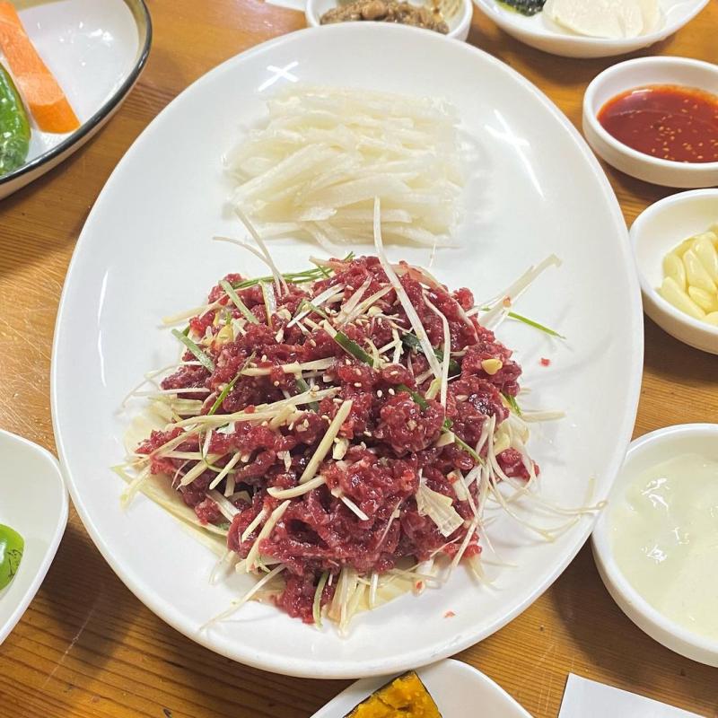 사실 뭉티기는 신선하게 당일 잡은 소로 해야하기 때문에 주말에는 뭉티기를 판매하지 않아요ㅠㅠ 저는 주말에 방문해서 뭉티기를 못먹고 육회를 먹었습니당! 평일에 방문하셔서 뭉티기 먹어보셔요! 완전 맛있어요💚 물론 육회도 맛있어용💘 얇게 썬 배랑 먹으면 달달하고 맛나요😊